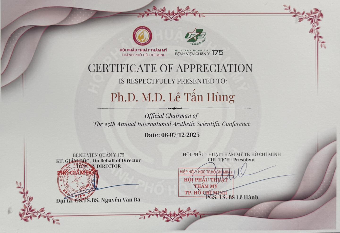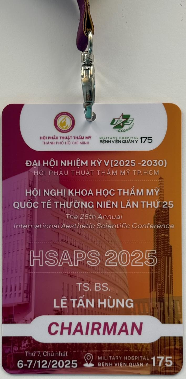 Tại Hội nghị Khoa học Phẫu thuật Tạo hình Thẩm mỹ Quốc Tế HSAPS 2025, TS.BS Lê Tấn Hùng vinh dự đảm nhiệm vai trò chủ toạ và đồng thời báo cáo thành công đề tài nghiên cứu ứng dụng thu nhỏ xương gò má bằng phẫu thuật cắt xương dạng chữ L — công trình lần đầu tiên được công bố tại Việt Nam.
